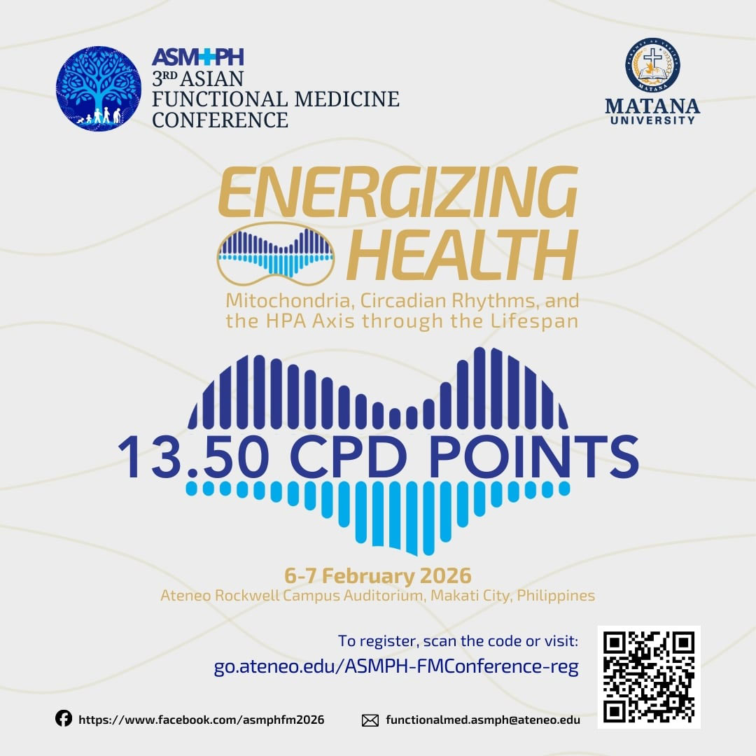 Happening on 6–7 February 2026 at the Ateneo Rockwell Campus Auditorium Makati, the conference carries the theme “Energizing Health: Mitochondria, Circadian Rhythms, and the HPA Axis through the Lifespan.”